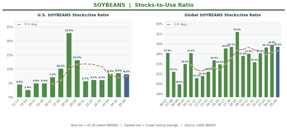 Globally, stocks ballooned to 283.12 mmt, a full 5.72 mmt above the 277.4 mmt estimate. World stocks-to-use at 34.52% confirms ample supplies everywhere you look. Demand simply isn’t rationing these stocks at current prices.
