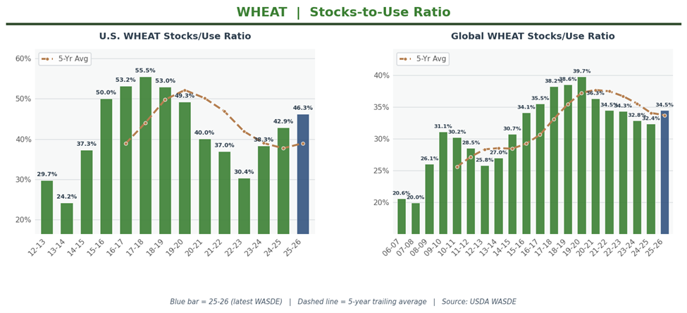 U.S. stocks-to-use at 46.28% is unambiguously burdensome: nearly half a year’s worth of wheat sitting in storage. Yet USDA still raised the season-average price 5 cents to $5.00 per bushel.