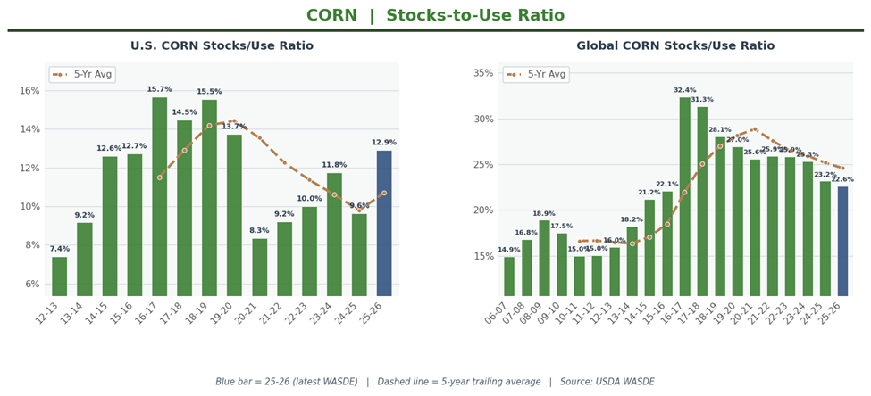 U.S. stocks-to-use at 8.21% remains tight by historical standards. Below 10% leaves little margin for any production hiccup or demand surge. Global stocks came in at 124.79 mmt, slightly under the 125.5 mmt estimate. World stocks-to-use at 29.3% sits just below the burdensome threshold but continues trending lower. The domestic crush story is quietly bullish; the export story is not.